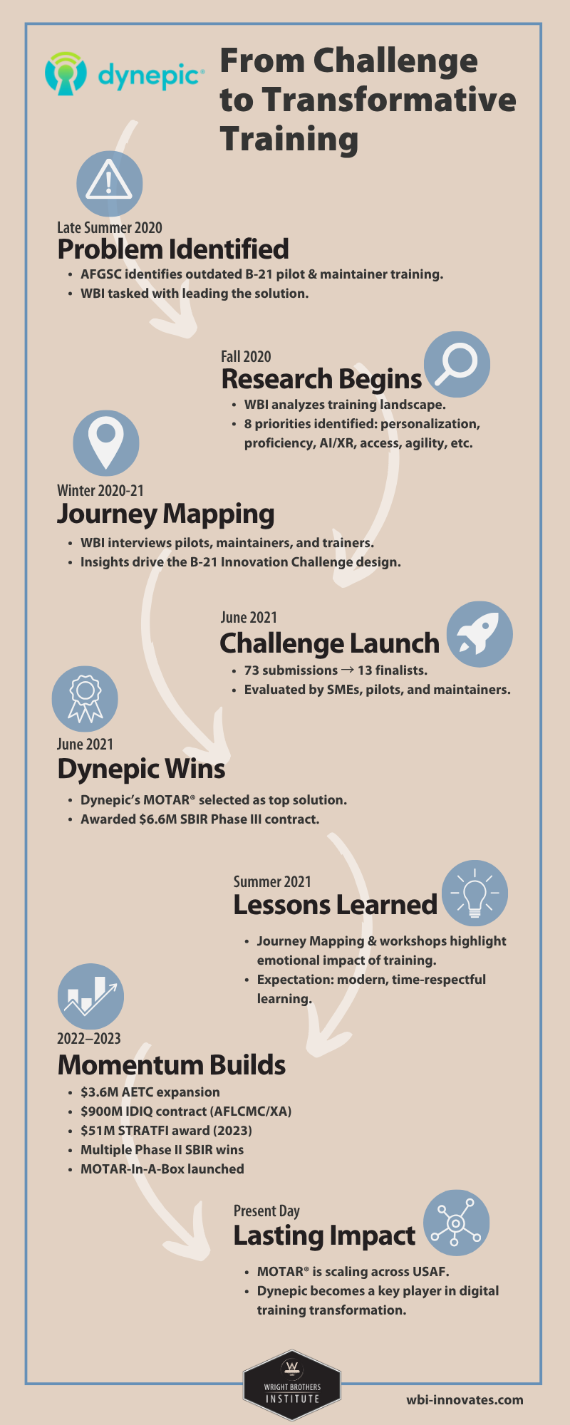 Dynepic’s story is a testament to what’s possible when government innovation teams like WBI and AFGSC collaborate intentionally with small businesses. From an open call to a mission-critical solution, MOTAR has evolved into a cornerstone of the Air Force’s training transformation—helping to ensure that the next generation of pilots and maintainers are not just ready, but ahead of the curve.